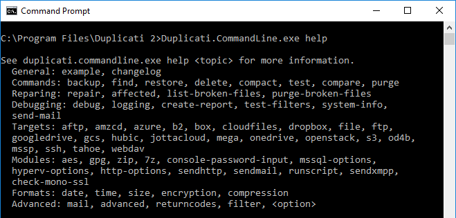 examplewill show a few examples of how the Commandline tool should be used to perform some simple operations. To show the examples, typeDuplicati.CommandLine.exe help example.