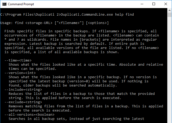 To get help about a specific topic, add it to the help command. So if you need help about the find command, type Duplicati.CommandLine.exe help find, which will return the following result: