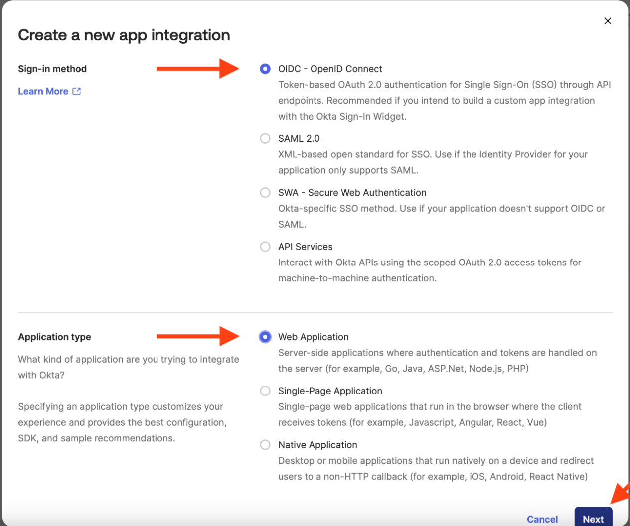 ### Choose sign-in method and application type