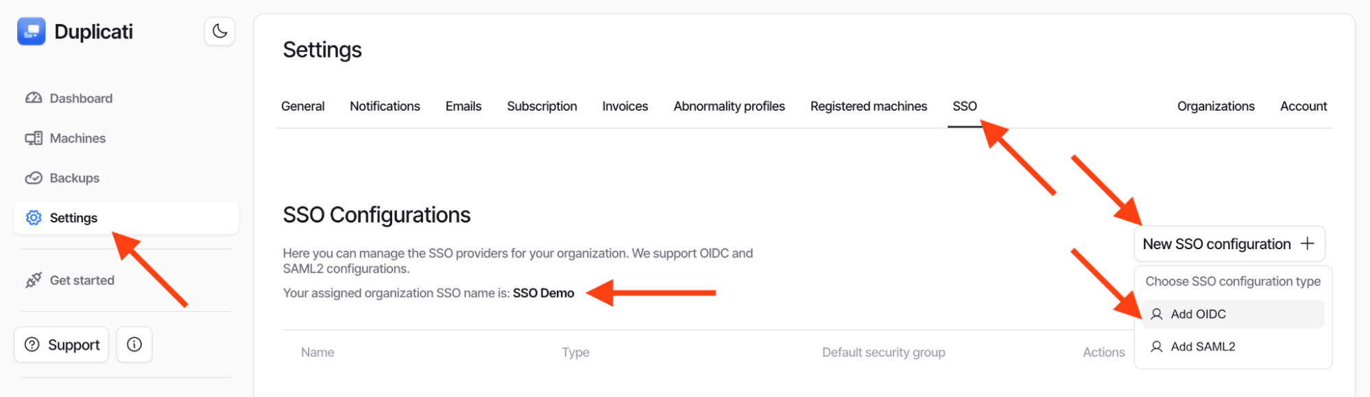 If the SSO tab is not visible, SSO may not be enabled for your organization; contact Duplicati sales or support.
