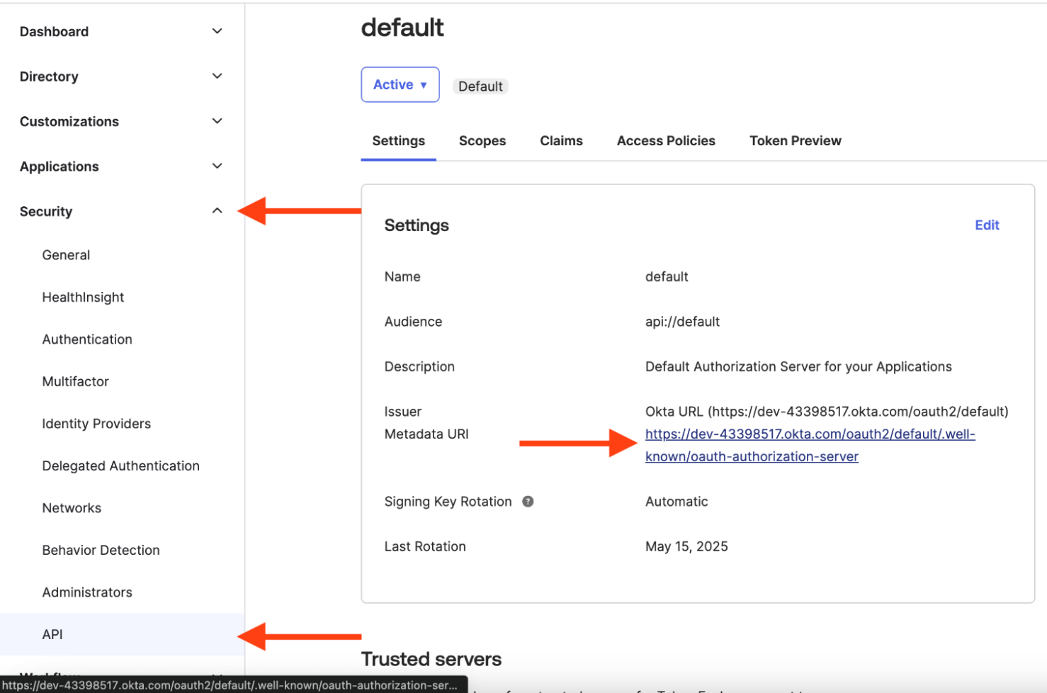 1. In Okta, go to **Security → API → Settings**.