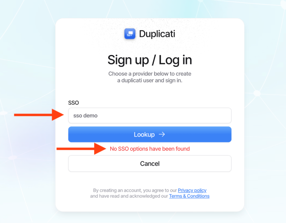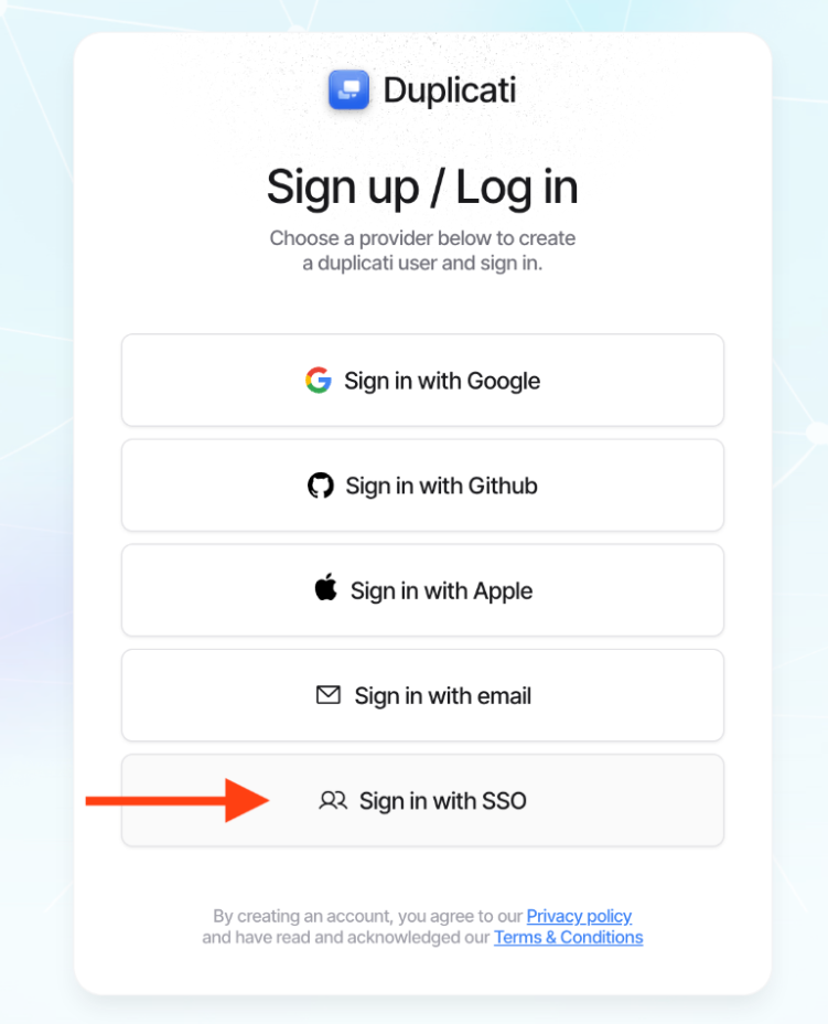 SSO is an additional Enterprise feature. Contact Duplicati sales or support if you need SSO enabled for your license or trial
