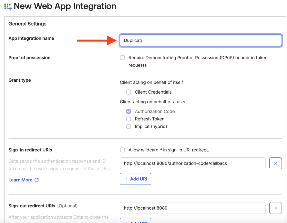 ### Create a Duplicati application in Okta