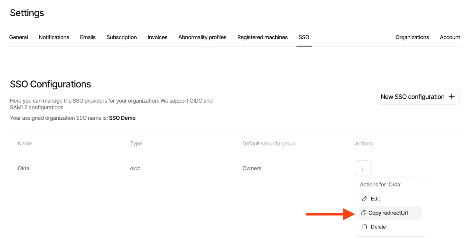 2. For the relevant SSO configuration, open the action menu.