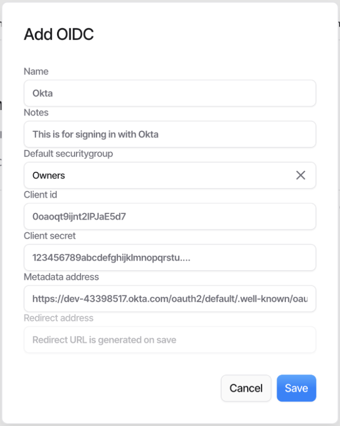 To configure OIDC, fill in values from the Okta application.