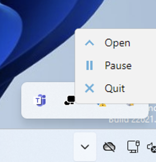 The TrayIcon is connected to the server and will change the displayed icon based on the server state. Opening the associated context menu, provides the option to quite, pause/resume, or open the UI.