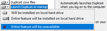 Select which components you want to install. Pay special attention to Launch Duplicati at startup. If it is selected, the Duplicati Tray Icon Tool will be started automatically after logging on to Windows. The Duplicati Server component is included in the Tray Icon tool. If you want to start the server component another way (i.e. by registering the server component as a Windows service), you have 2 options: