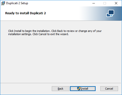 The installation procedure for Windows systems is pretty straightforward. Download the Windows MSI installer package from https://www.duplicati.com/download. If you have a 32 bit version of Windows, download the Windows 32 bit installer package.