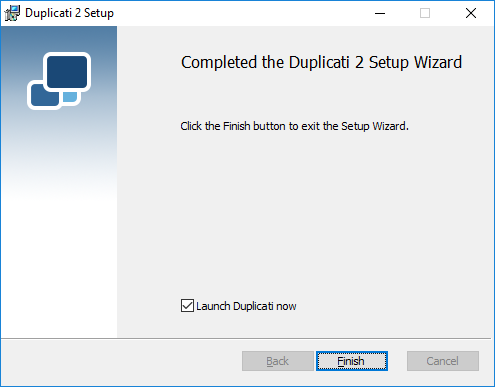 If you don't want to start the Duplicati Tray Icon tool now (i.e. if you want to register it as a service), deselect Launch Duplicati now.