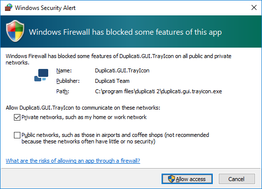 The first time the server component starts, Windows Firewall (or another third party firewall application) may show an alert. Allow Duplicati to communicate over the network.