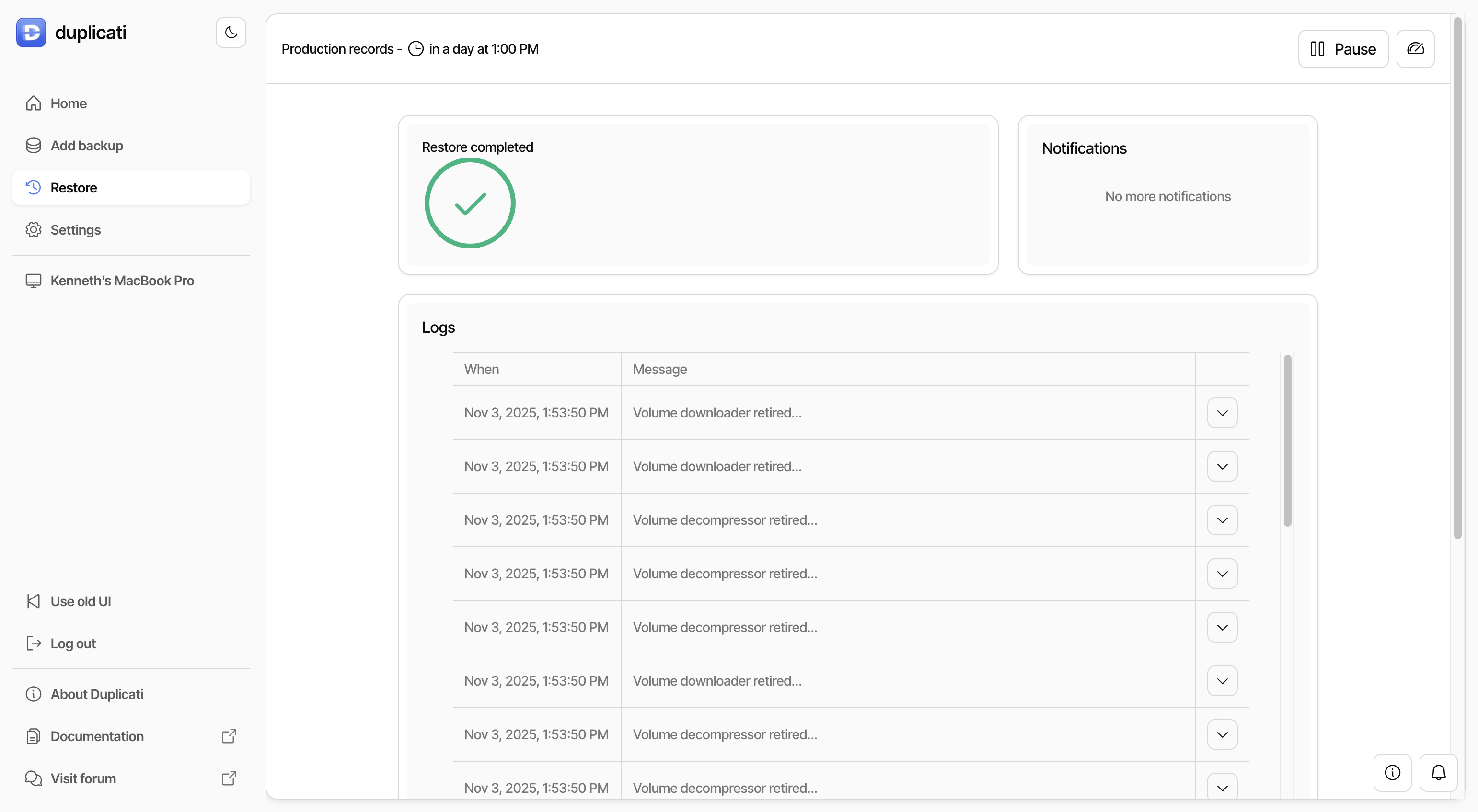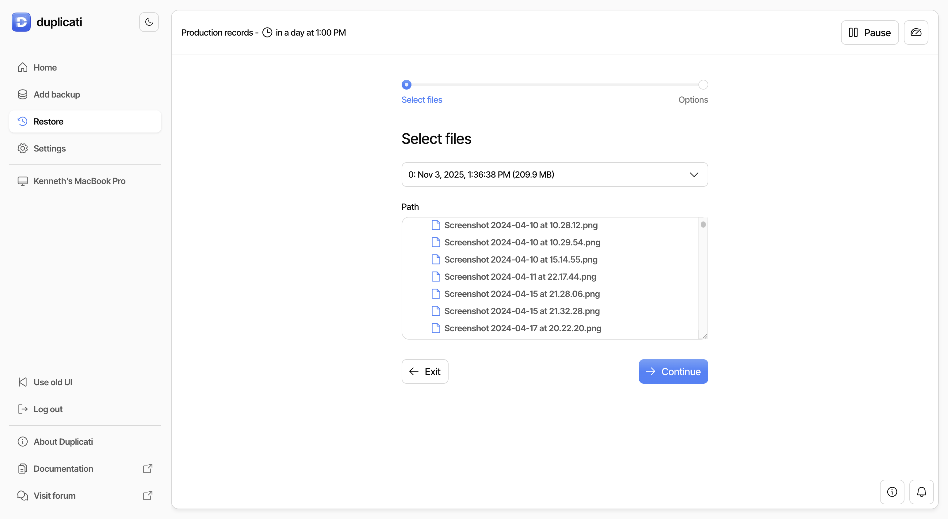 If the backup is not encrypted, leave the field empty. When ready, click "Continue" and Duplicati will examine the remote destination and figure out what backups are present. After working through the information, you can choose files to restore.