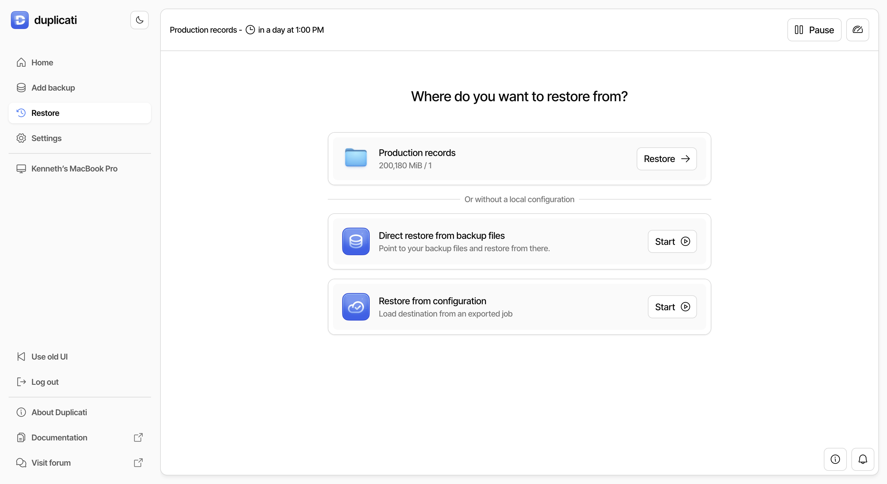 If you have exported the backup configuration and have the configuration available, you can click the "Start" button on "Restore from configuration" and skip to the restore from configuration section. You can also read up on how to import and export configurations.